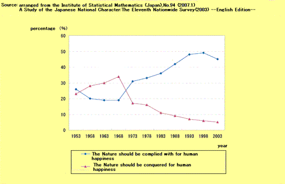 The following diagram indicates how sharp this turning point is: Yearly statistics conducted long time by a Japanese research institute shows a radical change from aggressive attitude to Nature to ecological perspectives in 1968.